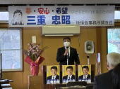 ![]() 2月4日(日)、今春の別府市議会議員選挙において4期目の闘いに臨む三重忠昭市議の事務所開きが開催されました。原田も全力で応援します。祈必勝! |